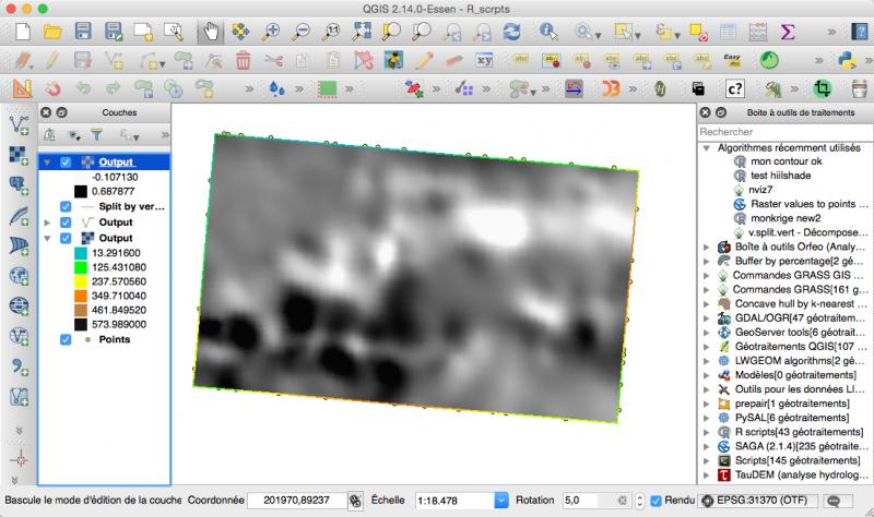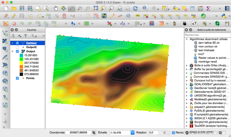 Il faut bien entendu que R soit installé et accessible en ligne de commande. Les principes du traitement par le module processing ont été exposés dans QGIS, le cas de l’extension Sextante sur Mac OS X ou comment la connaissance de Python permet de résoudre les problèmes, sans uniquement se lamenter... . Rappelons-les: