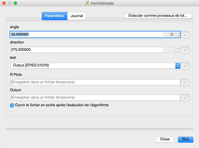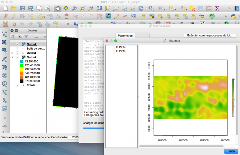 - Cela ce fait par un fichier intermédiaire /.../.qgis2/processing/processing_script.r qui est exécuté directement par R, d’où la nécessité que R soit disponible en ligne de commande pour exécuter R processing_script.r