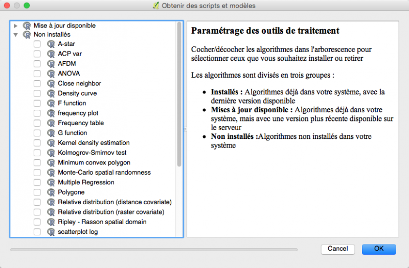 La Boîte à outils dispose d’un script pour créer un nouveau script (R scripts/Outils/Créer un nouveau script) et un autre pour installer les scripts disponibles à QGIS-Processing/rscripts (R scripts/Outils/Obtenir des scripts)