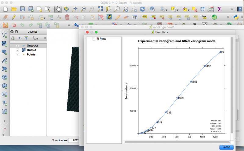 showplot indique que je veux afficher les figures (variogramme), Layer et Field correspondent à la couche et au champ traité, by est la pas de la grille utlisée et Outputr et Outputv les couches raster et vecteur en sortie
