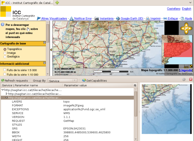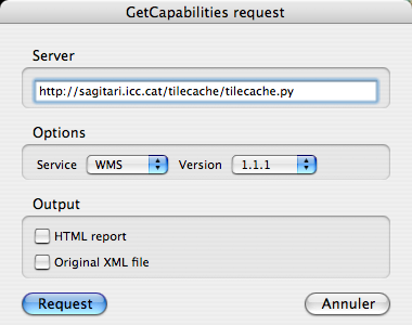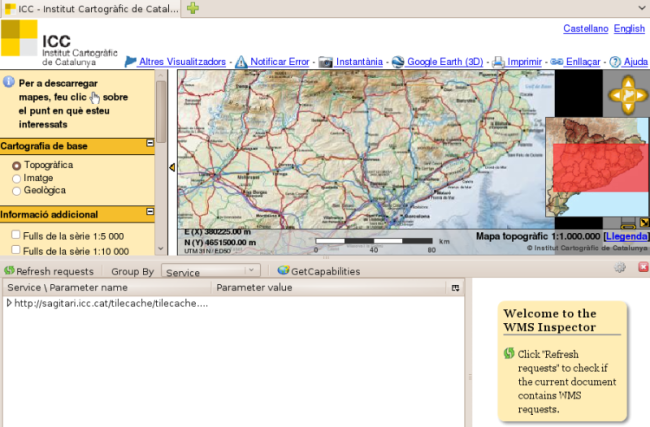 Nous allons tester l'extension avec le très beau site de l' Institut Cartographique de Catalogne. Un clic sur le bouton WMS et la fenêtre WMS-Inspector apparait: