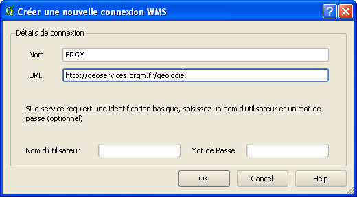 4) Ajoutez l'adresse url de votre service web préféré : ici, nous vous proposons l'accès aux scan des cartes géologiques du BRGM. à l'aide de l'adresse suivante: geoservices.brgm.fr/geologie