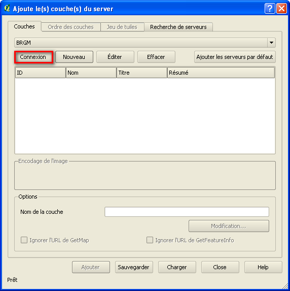2) Ouvrez les paramètres d'accès à un serveur WMS en cliquant sur le bouton "ajouter une couche WMS".