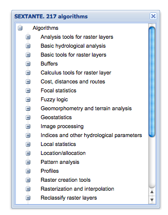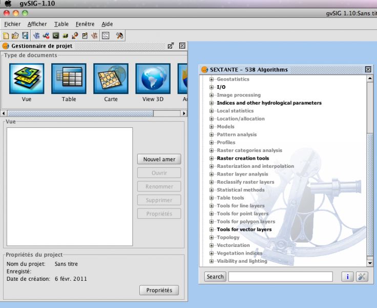 Pour rappel, Sextante, est une librairie Java contenant un très grand nombre de fonctions géospatiales. Basée à l'origine sur SAGA GIS, puis portée et développée pour gvSIG, c'est devenu une librairie Java indépendante qui peut être intégrée aux nombreux SIG Java. C'est pourquoi, en plus de gvSIG, OpenJump, Kosmo ou Udig peuvent maintenant l'utiliser. Dans tous les cas, elle s'installe comme une extension de l'application concernée.