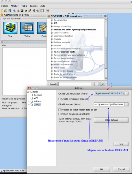 L'élément le plus important est le système de projection du secteur. De même qu'avec la démarche précédente, un clic sur le bouton « Setup GRASS » et GRASS apparaitra dans la fenêtre Sextante: