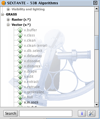 Sextante offre donc la possibilité d'utiliser les fonctions de GRASS GIS pour le traitement des vecteurs et des rasters, en plus de ses très nombreuses fonctions propres. Mais il ne fait que les utiliser, car les résultats ne sont pas disponibles dans GRASS GIS (comme le plug-in GRASS de Quantum Gis). Le jeu de données (Mapset) ne sert à Sextante qu'à placer ses fichiers temporaires, en accord avec les paramètres du secteur (Localisation). Il est possible de placer plusieurs jeux de données sextante dans différents secteurs (en fonction des projections) et de choisir l'un d'entre eux en fonction de ses caractéristiques. Malheureusement, Sextante n'offre pas encore la possibilité de charger les couches GRASS directement ou de les exporter comme le fait Quantum Gis.