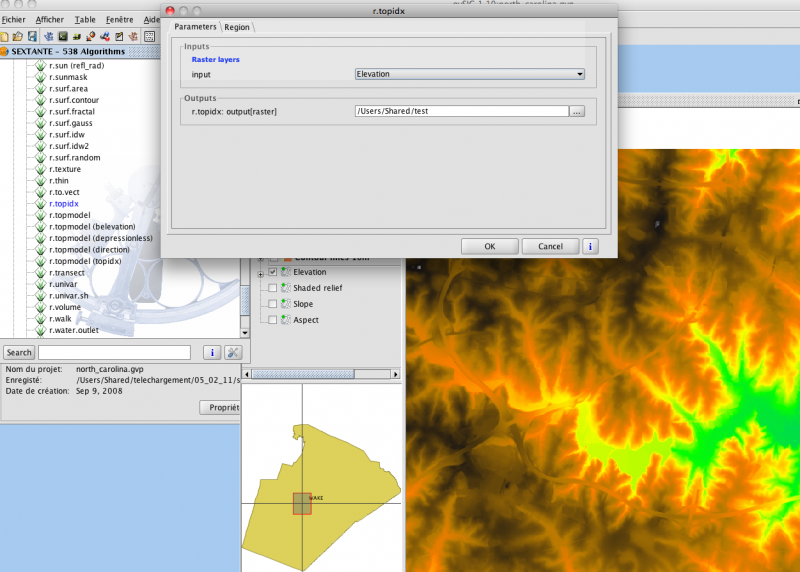 - à la plus complexe, application de r.topidx (création d'un index topographique, grass.osgeo.org/gdp/html_grass64/r.topidx.html) sur un DEM (exemple donné par grass.osgeo.org/wiki/GRASS_and_Sextante)