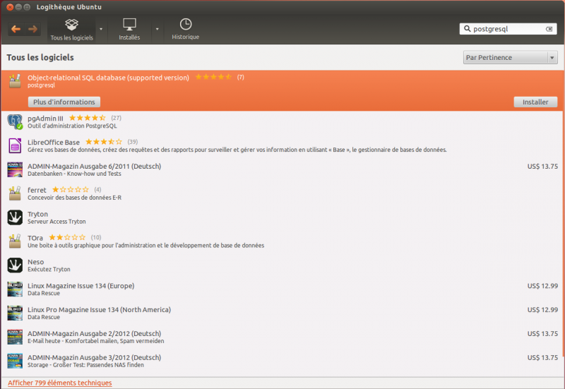 La première est d’installer cette application directement depuis la logithèque Ubuntu en rentrant « postgresql » dans la barre de recherche comme indiqué ci-dessous :