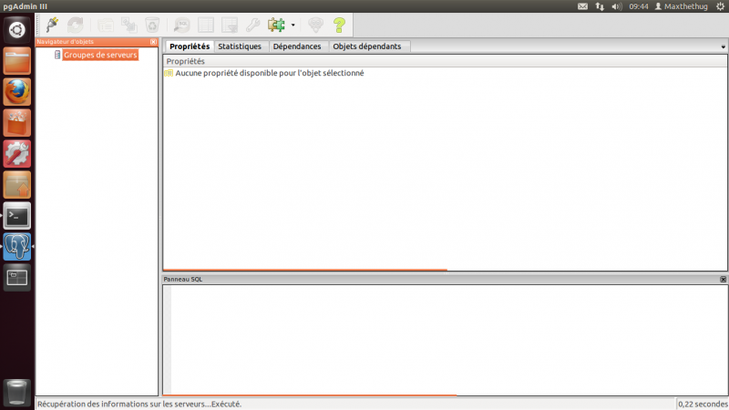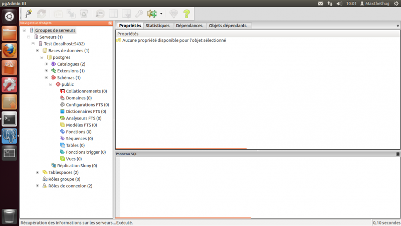 Taper « o » si besoin pour confirmer le téléchargement et l’installation du paquet. L’icône de PgAdmin3 devrait alors apparaître dans la barre de raccourci. Si ce n’est pas le cas, et plutôt que de rechercher dans les différents programmes où l’application peut bien être, le plus simple est encore de taper la ligne suivante dans un terminal pour le lancer :