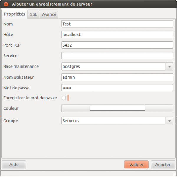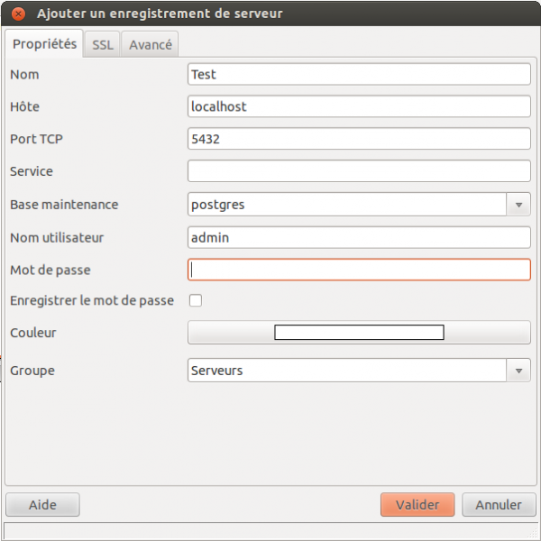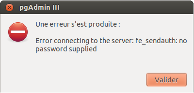 Nous laissons volontairement le champ mot de passe vide pour observer les conséquences des modifications du fichier pg_hba.conf faîtes précédemment.