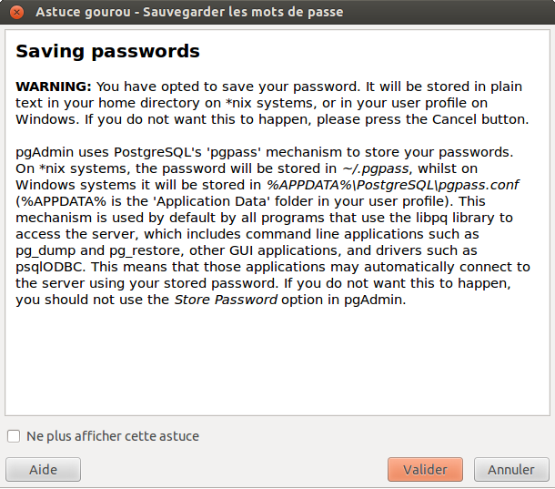 Pour plus de précisions, voici le message que PgAdminIII affiche quand un utilisateur choisit d’enregistrer son mot de passe :
