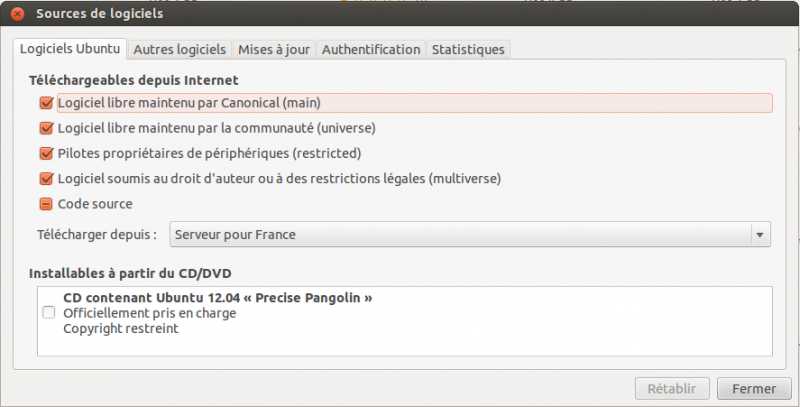 Afin de pouvoir installer les applications dont nous aurons besoin par la suite, il est conseillé d’installer dès le départ les dépôts qui ne seraient pas présents nativement dans la version 12.04 d’Ubuntu, autrement dit, le dépôt UbuntuGis, qui comme son nom l’indique permet d’installer des librairies et des logiciels permettant de faire du SIG sur Ubuntu ; le dépôt postgresql qui contient la dernière version (9.3) du SGBD et le dépôt QGIS qui lui aussi contient la dernière version en date du logiciel éponyme (2.2-Valmiera).
