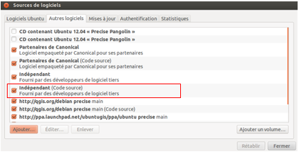 Cliquer ensuite sur ajouter une source de mise à jour pour constater que le dépôt ubuntugis a bien été ajouté aux sources de logiciels.