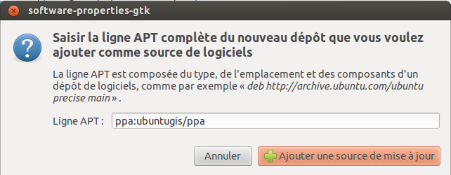Pour ajouter le dépôt UbuntuGIS, il suffit de cliquer sur ajouter et de remplir le formulaire qui s’ouvre dans la fenêtre suivante comme ceci :