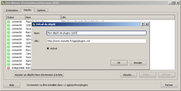 Le fichier XML ainsi que le ou les fichiers zip doivent être accessibles via internet. Il n'y a plus qu'à indiquer à QGIS l'adresse du fichier XML pour ajouter le dépôt et ses extensions. Cela ce fait dans le menu "Extension / Récupération des extensions en Python" puis onglet "Dépôt" bouton "Ajouter...". La fenêtre demande un nom du dépôt ainsi que l'URL qui pointe sur le fichier XML. La case "Activé" doit rester cochée. Ces informations pourront être éditées par la suite (bouton "Éditer...") et seront gardées en mémoire par QGIS pour les prochaines sessions.