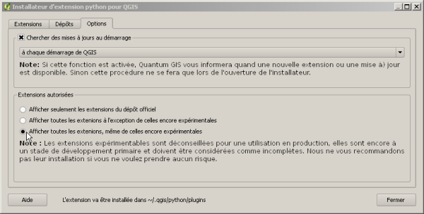 Fenêtre d'options de l'installateur d’extensions QGIS