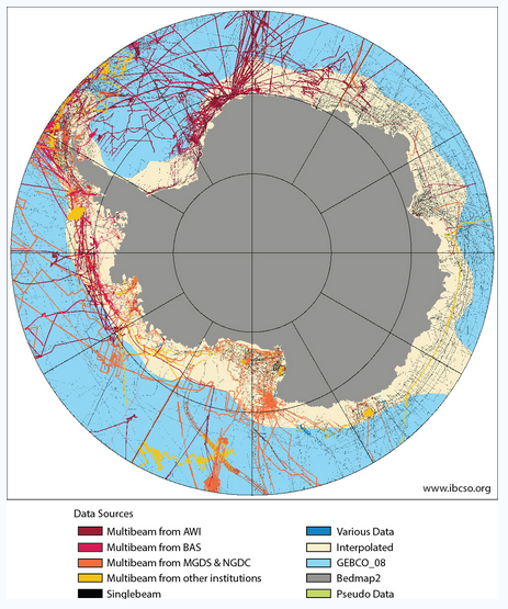 Image: Carte des sources de données bathymétriques IBCSO. (Détails et image sur http://www.ibcso.org/data.html)