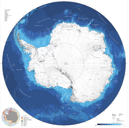 Compilant les données de plus de 30 institutions (15 pays), la carte des fonds marins antarctiques IBCSO est disponible en deux versions: "Ice surface" présentant la surface des glaces et "Bedrock" présentant le substrat rocheux.
