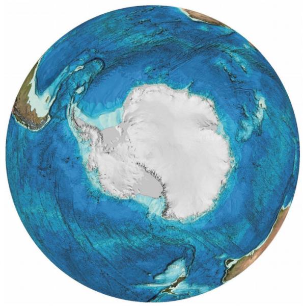 Image: Vue 3D de la bathymétrie GEBCO autour de l'Antarctique, produite avec le logiciel Fledermaus. (Image et détails disponibles sur http://www.gebco.net/data_and_products/gridded_bathymetry_data/grid_plots/).