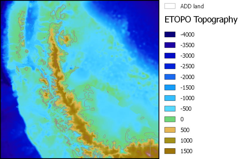 Image: Topographie ETOPO1 (bedrock) le long de la Péninsule Antarctique. Le trait de côte est issus de l'Antarctic Digital Database (voir chapitre I).