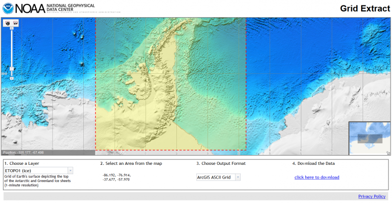 L'accès aux grilles ETOPO1 se fait via une interface cartographique (http://maps.ngdc.noaa.gov/viewers/wcs-client/). Après avoir sélectionné la couche souhaitée ("Ice surface" ou "Bedrock"), on peut choisir une étendue (via un rectangle sur la carte ou en entrant directement des coordonnées) et un format puis télécharger les données sélectionnées.
