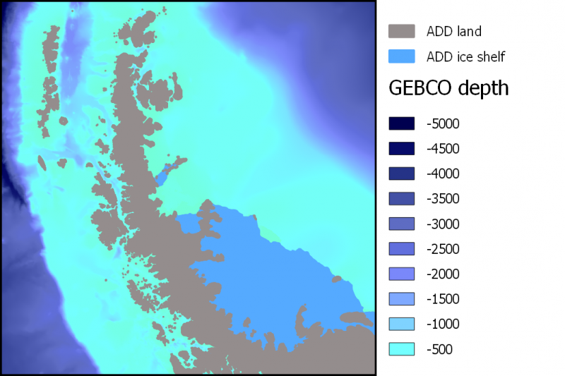 La GEBCO donne une bonne impression générale de la bathymétrie autour de l'Antarctique mais n'est plus assez précise quand on se rapproche des côtes.