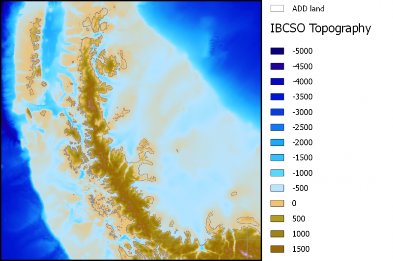 Image: Topographie IBCSO (bedrock) le long de la Péninsule Antarctique. Le trait de côte est issus de l'Antarctic Digital Database (voir chapitre I).