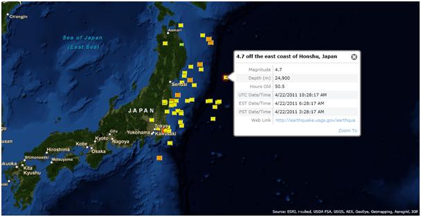 ESRI récupère les données de l’USGS pour afficher les épicentres des séismes et leurs particularités (magnitude, profondeur, date) sous forme d’info bulles. Cette carte est mise à jour quasiment à temps réel.