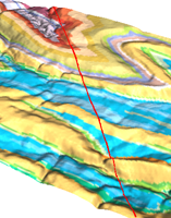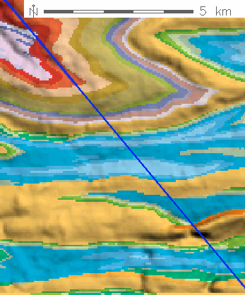 La ligne de profil est numérisée (ligne rouge) sur l'ensemble MNT-carte géologique. L'objectif final est d'obtenir une ligne de profil topographique (MNT) coloriée avec les couleurs de la carte géologique.