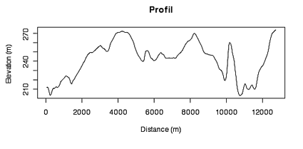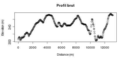 La démarche pourrait être faite avec de nombreux logiciels, comme un tableur ou gnuplot, mais j'ai choisi de le faire avec R qui s'intègre très bien avec Grass, comme cela a déjà été montré sur ce Portail. L'utilisation de R pour créer les profils à partir des points obtenus dans Grass a déjà été illustrée comme nous le verrons par la suite.