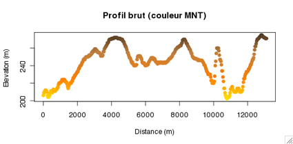> plot(m1$distance,m1$elev,pch=21,col = rgb(m1$r/255,m1$g/255,m1$b/255), + bg = rgb(m1$r/255,m1$g/255,m1$b/255),xlab='Distance (m)', + ylab='Elevation (m)', main='Profil brut (couleur MNT)')