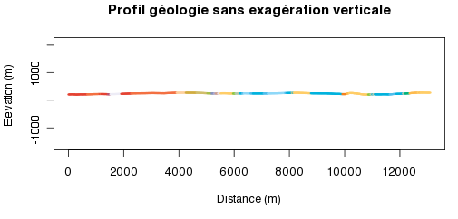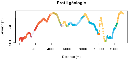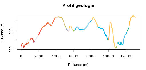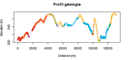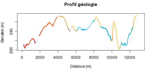 > plot.new() > plot.window(xlim=range(m2$distance),ylim=range(m2$elev)) # plot des segments de ligne, lwd = épaisseur des segments de ligne > i = 0 > while(i <= length(res$distance)-1){ + i = i + 1 + segments(res$distance[i],res$elev[i],res$distance[i+1],res$elev[i+1], + col=rgb(res$r[i]/255,res$g[i]/255,res$b[i]/255),lwd=3) + } > axis(1); axis(2); box(); > title(main="Profil géologie", xlab="Distance (m)", ylab="Elevation (m)")