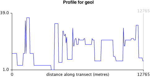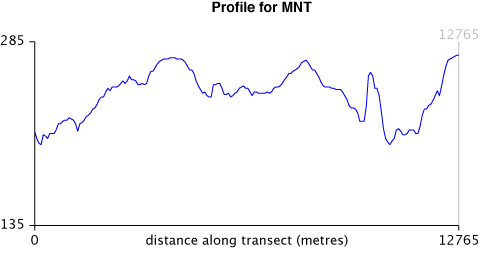 "Note that the elevation profiles are calculated in a rather non-standard way, as elevation is plotted against 3D distance along the original line segment. This means that resulting transect length calculations are sensitive to the resolution of the raster (or distance between sample points), across a rough surface: i.e. smaller grid spacing will result in a longer effective (3D) transect length."