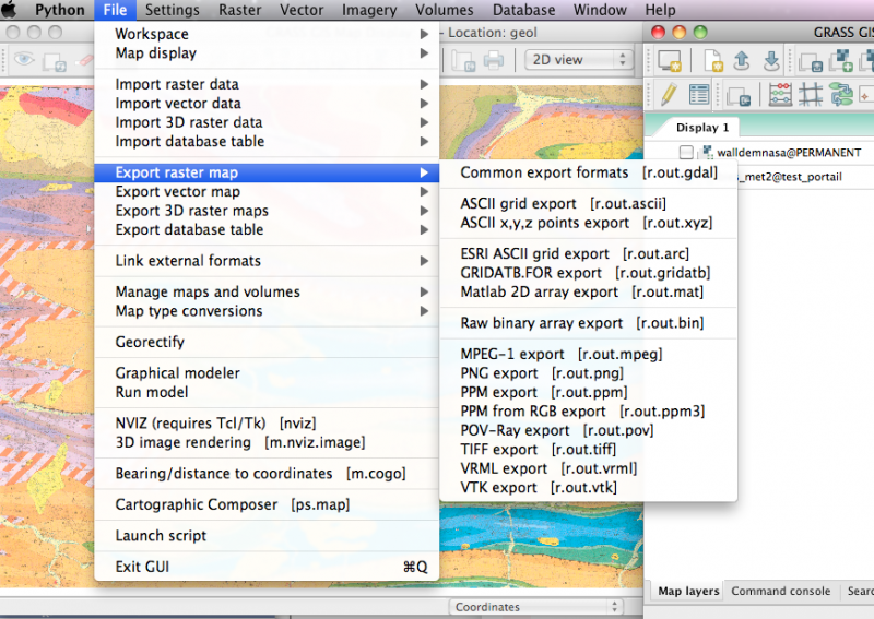 - à partir du menu File/Export vector map avec plusieurs options, r.out.gdal étant la plus générale.
