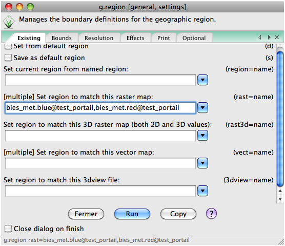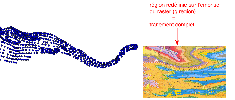 En pratique, une région n'est qu'une fenêtre de traitement (N,S,E,W) avec une certaine résolution. Une fois définie, tous les traitements postérieurs ne s'appliqueront exclusivement qu'à ce qui est dans la région et rien d'autre