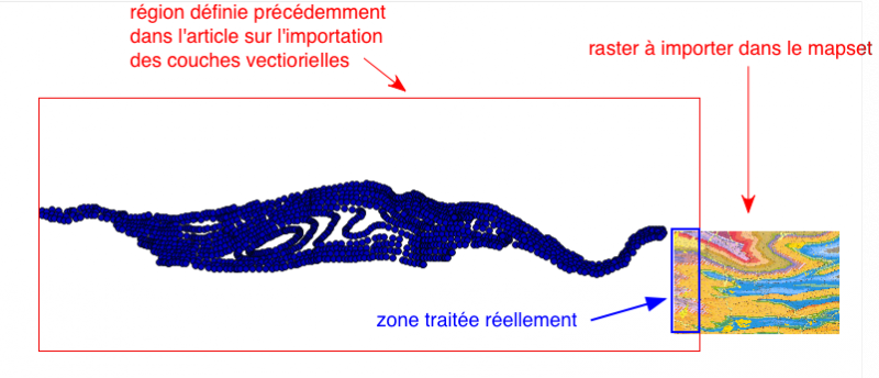 - La région a été définie précédemment sur base du vecteur importé dans l'article GRASS GIS pas à pas pour les débutants: 2 - importer des couches vectorielles. Il est possible de voir que cette région ne couvre qu'une infime partie de l'emprise du raster à importer. r.composite n'agira donc que sur la zone du rectangle bleu.
