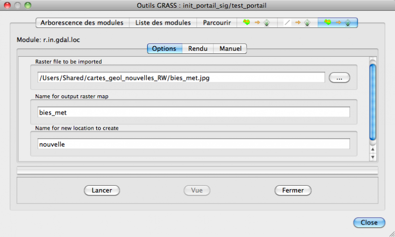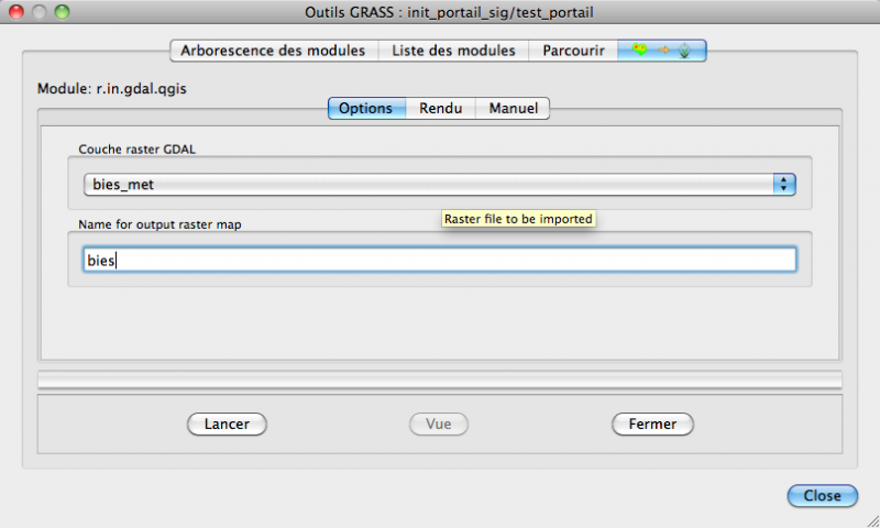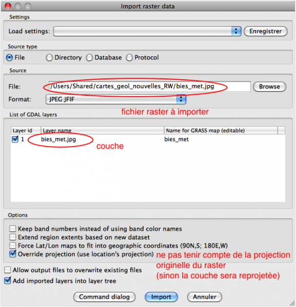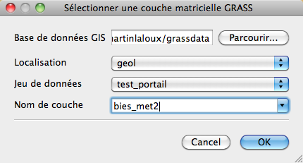 Comme avec les vecteurs, il vaut mieux cocher Override dataset projection (use location's projection) sous peine de surprises. Il y a tout aussi moyen d'importer une couche directement à partir de Quantum GIS avec la commande des Outils GRASS, r.in.gdal.qgis: