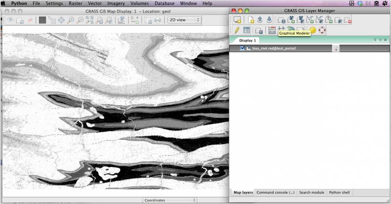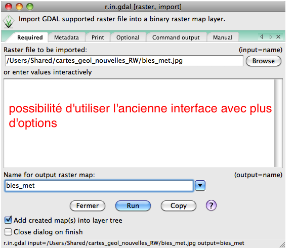 - à partir de la ligne de commandes du Layer Manager ou à partir du Shell GRASS