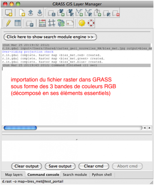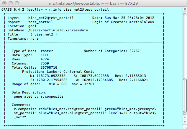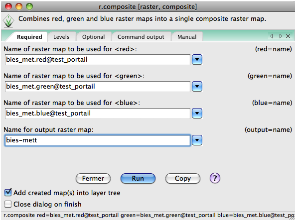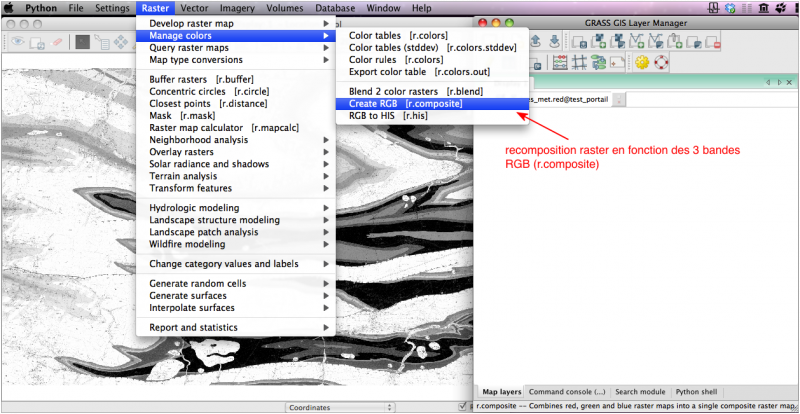 - lors de l'importation un fichier raster multibande, il sera toujours décomposé en ses éléments essentiels (fichiers .red, .green et .blue) pour les traitements futurs. Il y a toujours moyen de recomposer l'image avec r.composite.