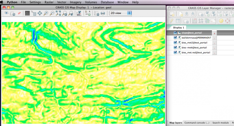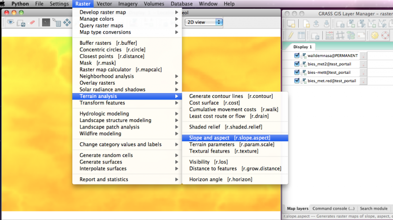 Le fichier ou les fichiers étant importé avec la bonne région il est maintenant possible de lui appliquer tous les traitements disponibles dans GRASS GIS à partir du menu Raster:
