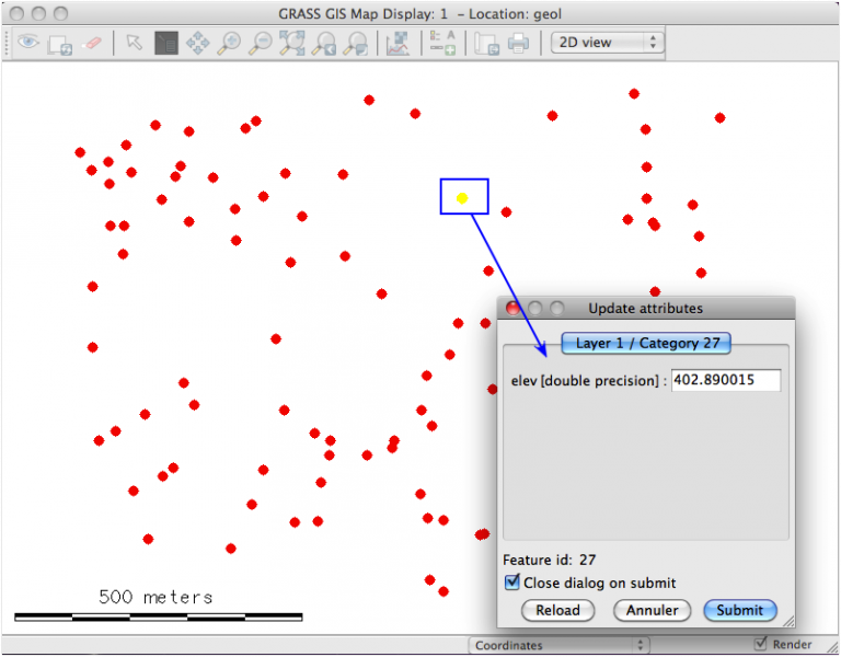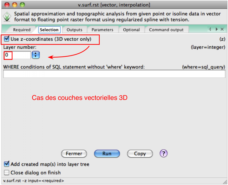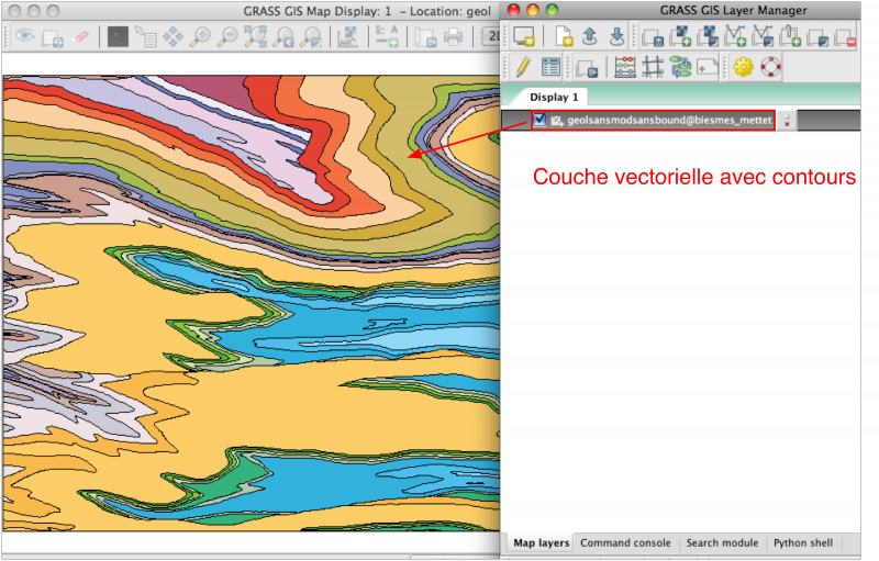 - Si vous avez lu GRASS GIS : géométries, topologies et conséquences pratiques (vecteurs, rasters, volumes), vous comprendrez une des spécificités de GRASS: une couche vectorielle est composée de plusieurs couches (layer 0, layer 1, etc.). Dans le cas d'une couche 3D, la valeur z se trouve dans la couche 0 (layer 0)