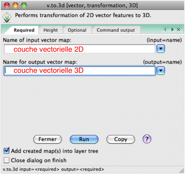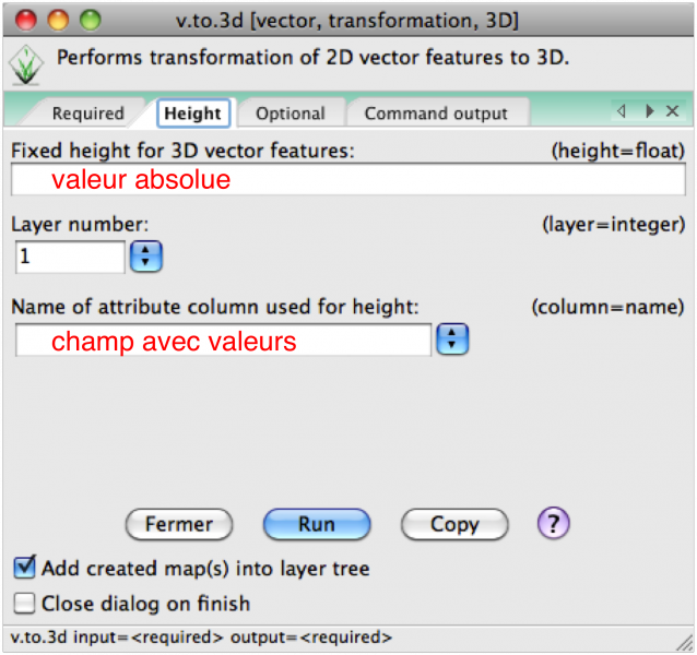 - v.to.3D (menu File/Map type Conversion ou Vector/Map type Conversion) à partir d'un champ de la table d'attributs ou d'une valeur constante: