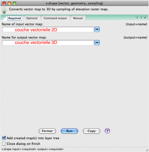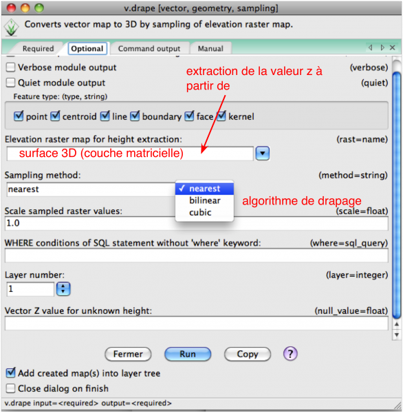 - v.drape (menu Vector/Develop vector map), à partir d'une surface existante