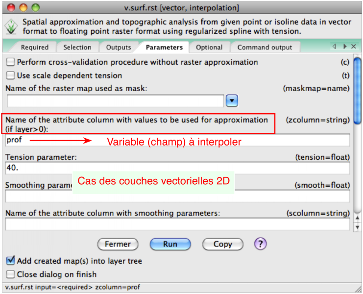 - v.surf.rst -> interpolation par splines régularisées avec tension (RST, regularized splines with tension) à partir de couches vectorielles.