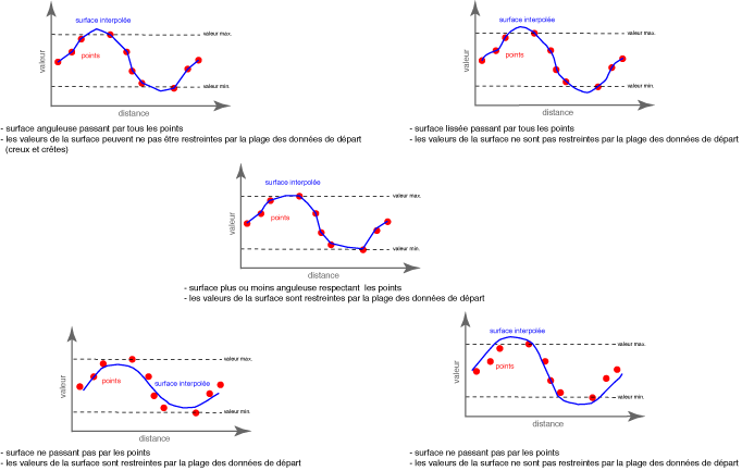 - Certaines méthodes forcent les surfaces à passer par tous les points, d'autres mettent l'accent sur le lissage de la surface et certaines sont plus complexes que d'autres.