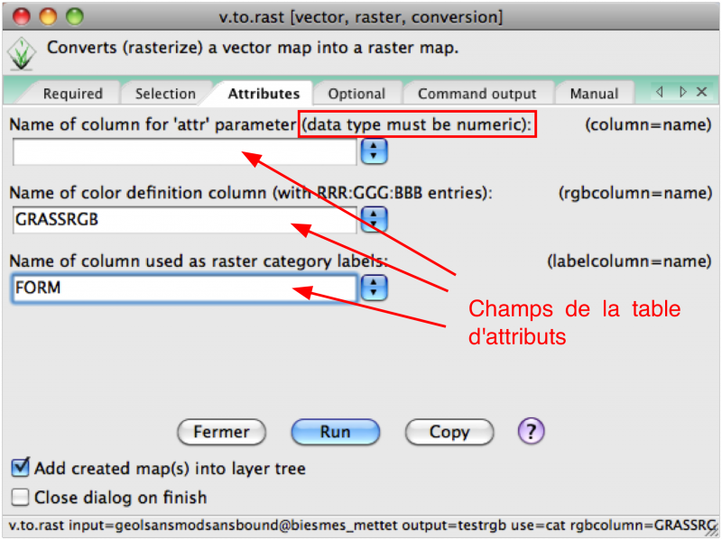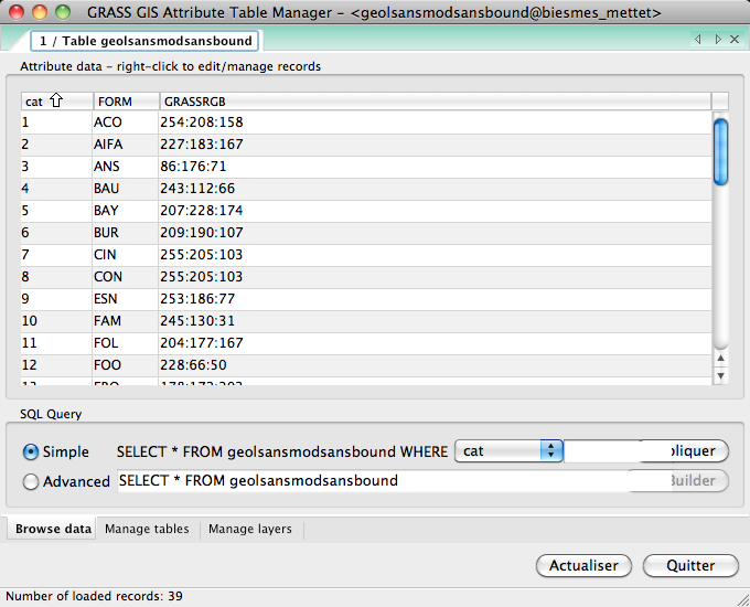 avec la table d'attributs (FORM = Formations géologiques, GRASSRGB = couleur):