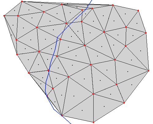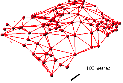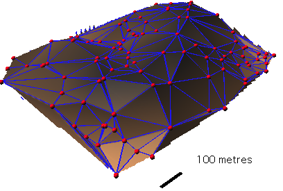 Cette couche vectorielle peut aussi être transformée en surface matricielle avec, par exemple, le module en Python tin.to.raster.py proposé Antonio Alliegro (digilander.libero.it/antonioall/python_tin2raster.html, en italien) (ici v.to.rast ne marche pas bien). Le processus doit être effectué avec un MASK (voir GRASS GIS pas à pas pour les débutants: 6 - les masques (MASK) et leurs utilisations, rapport avec les régions et l'algèbre des cartes):