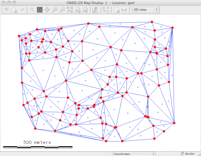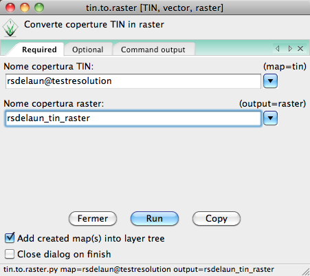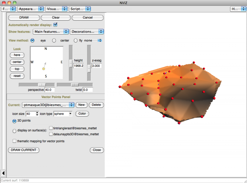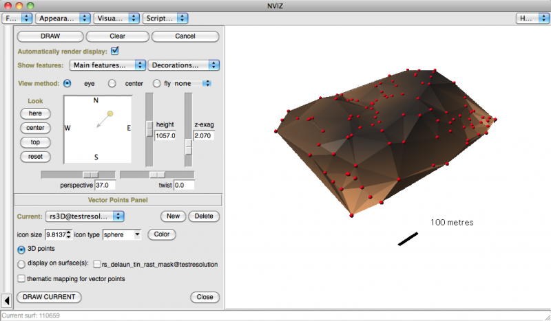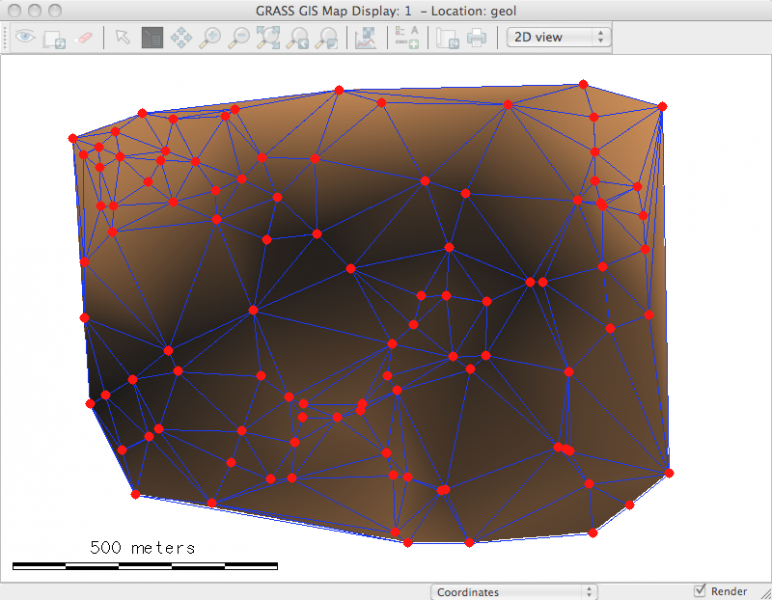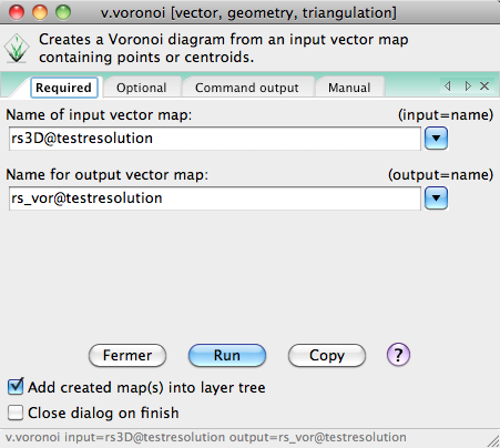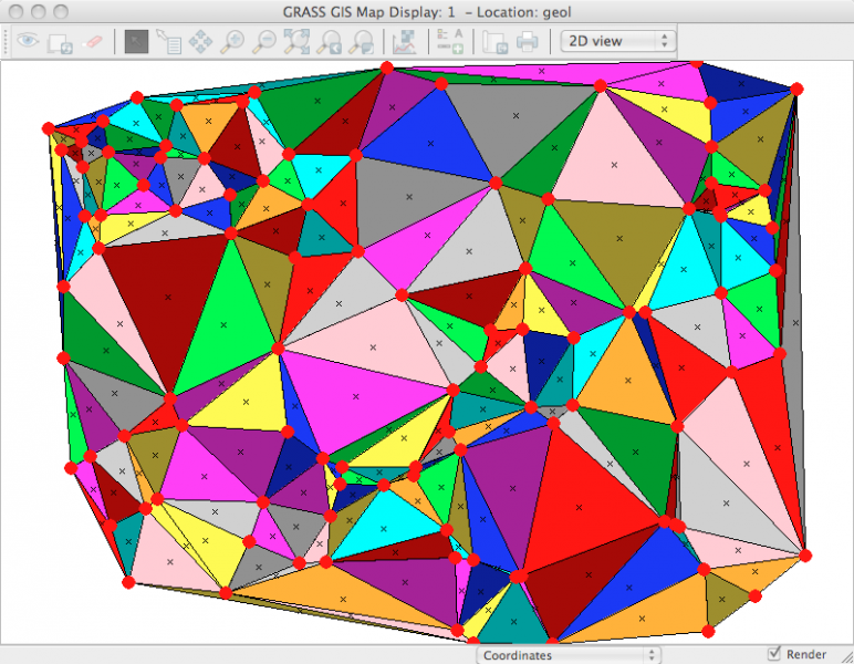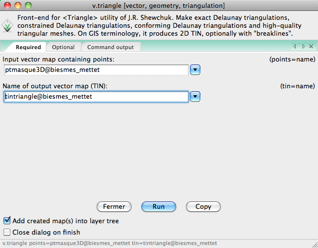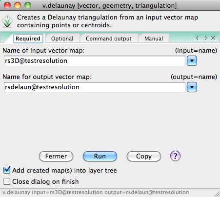 C'est la commande v.delaunay (adaptée par Pavlovsky, 2008) qui est utilisée. Dans le cas de points 2D le résultat sera une couche vectorielle 2D, dans le cas de points 3D (ce qui est le cas ici), le résultat sera une couche vectorielle 3D à faces (voir GRASS GIS : géométries, topologies et conséquences pratiques (vecteurs, rasters, volumes)).