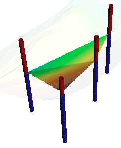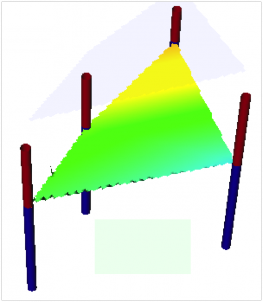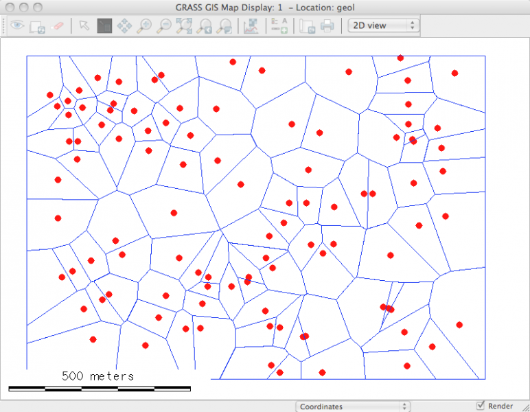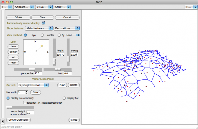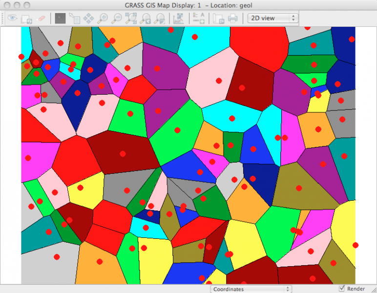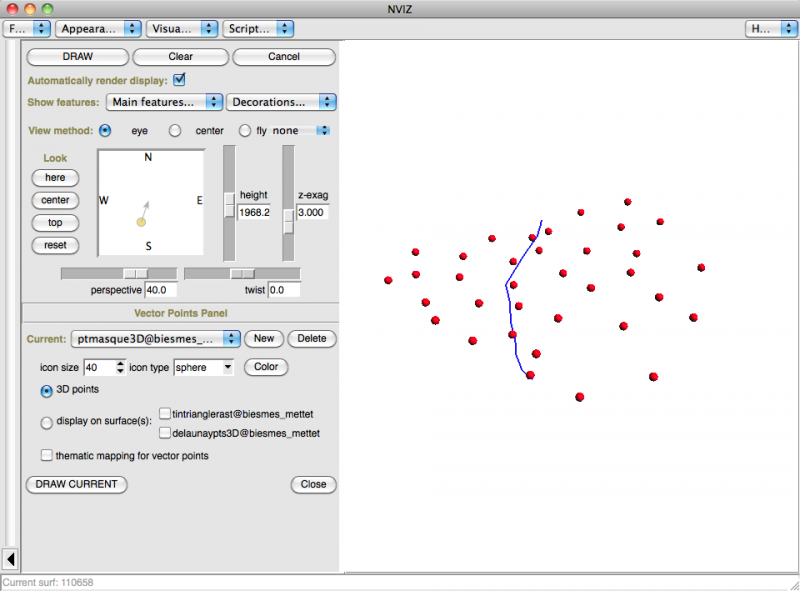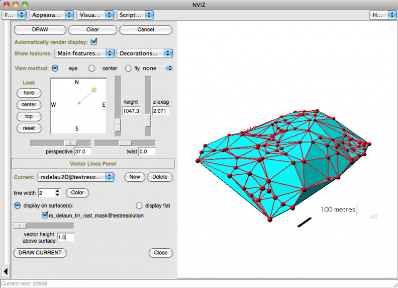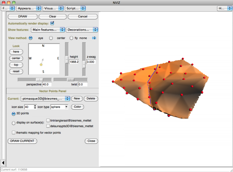 C'est la commande v.delaunay (adaptée par Pavlovsky, 2008) qui est utilisée. Dans le cas de points 2D le résultat sera une couche vectorielle 2D, dans le cas de points 3D (ce qui est le cas ici), le résultat sera une couche vectorielle 3D à faces (voir GRASS GIS : géométries, topologies et conséquences pratiques (vecteurs, rasters, volumes)).
