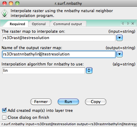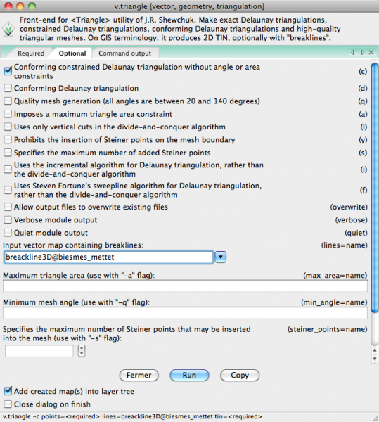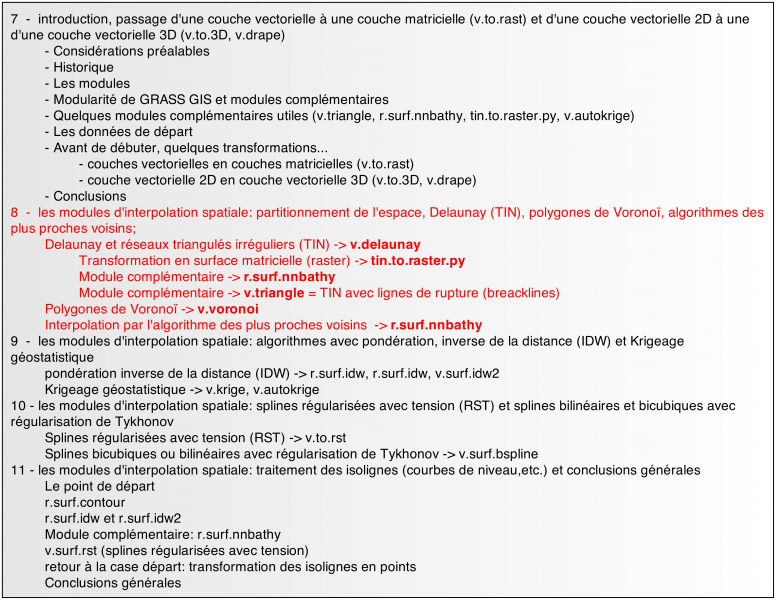 Parmi ceux présentés dans la première partie nous utiliserons le module r.surf.nnbathy avec l'algorithme lin (linéaire) ou l, basé sur le programme Triangle (www.cs.cmu.edu/~quake/triangle.html)